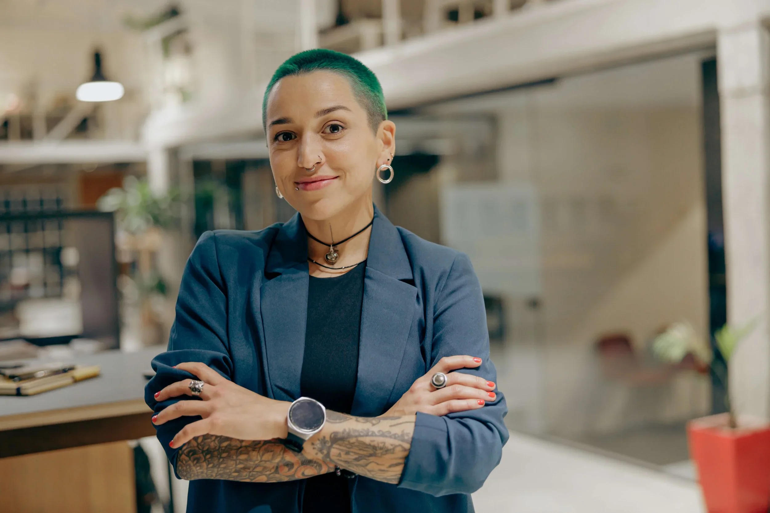 Professional person with arms crossed representing confidence and support during major life transitions